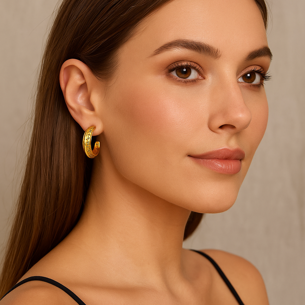 Questi orecchini a cerchio si distinguono per il design geometrico inciso che unisce eleganza classica e modernità. Le linee simmetriche creano un effetto visivo raffinato, aggiungendo carattere e luminosità a ogni stile, perfetti per completare un look sobrio o sofisticato.