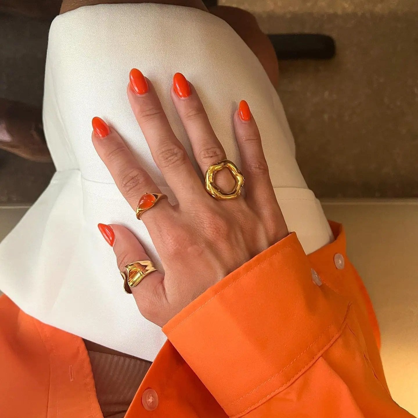 Questo anello dal design organico si distingue per le sue linee irregolari e fluide che creano un effetto visivo unico e armonioso. La forma aperta e sinuosa dona un carattere contemporaneo, evocando la naturale eleganza delle forme plasmate dal tempo. Un accessorio versatile e raffinato, perfetto per completare con equilibrio e personalità qualsiasi stile.