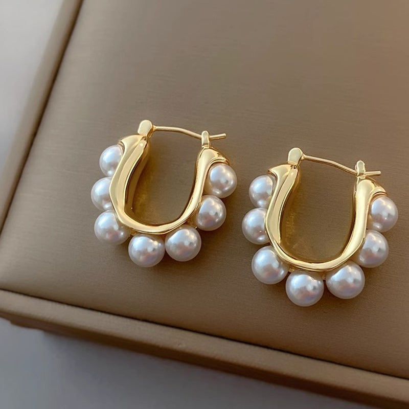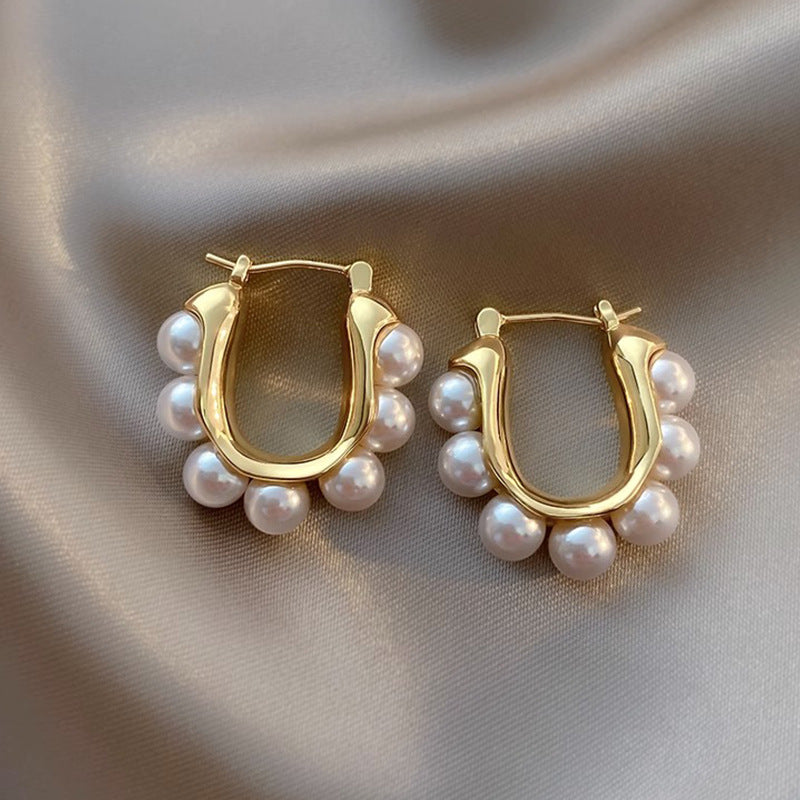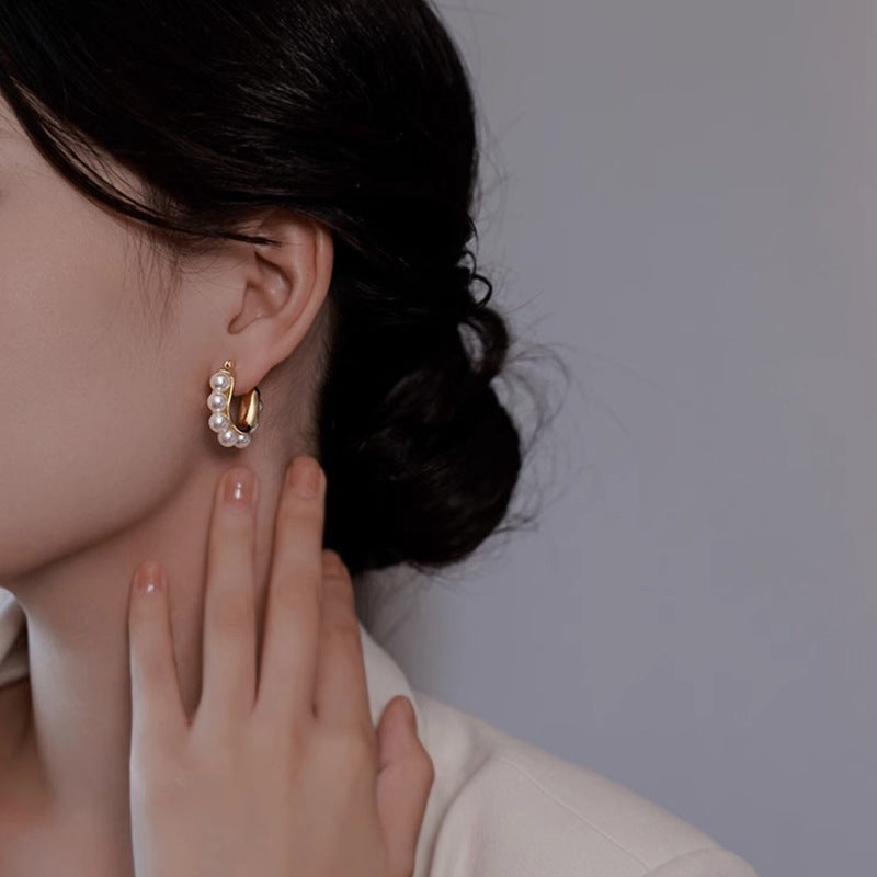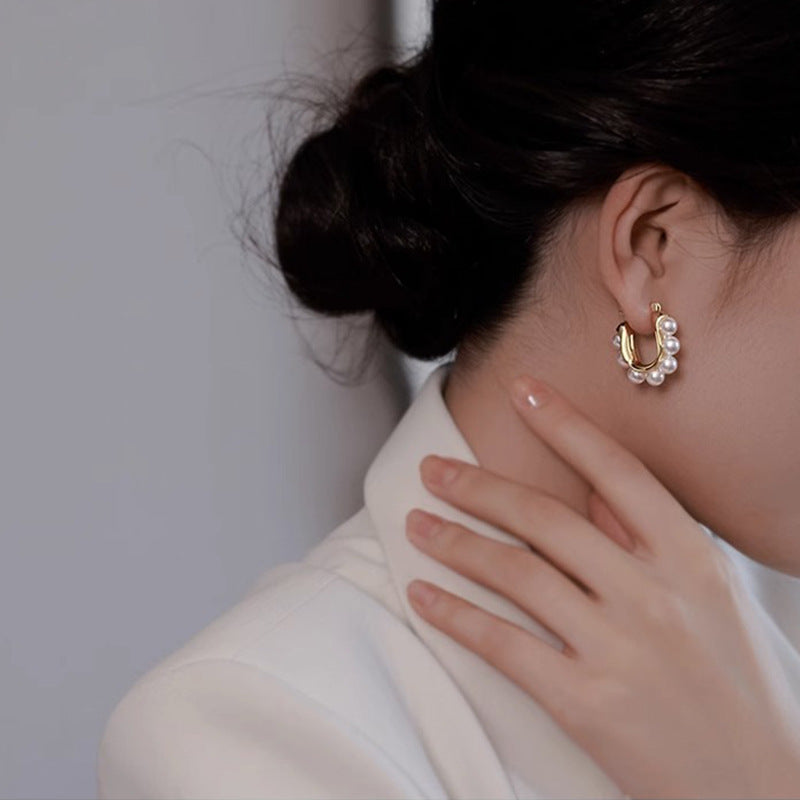 Questi orecchini a cerchio con perle incarnano una raffinata fusione tra classicità e design moderno. La silhouette arcuata e la disposizione simmetrica delle perle creano un equilibrio armonioso, donando luminosità e grazia a ogni movimento. Perfetti per aggiungere un tocco elegante e senza tempo a qualsiasi look.